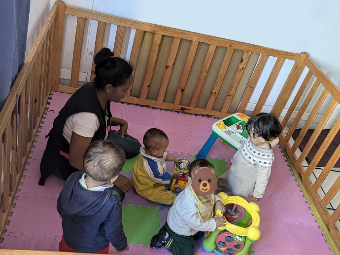 Deux auxiliaires de puériculture prennent soi des tout-petits pendant les heures de travail. Une pédiatre intervient une fois par mois à la crèche pour assurer une visite médicale, prodiguer des conseils en nutrition et partager des bonnes pratiques pour le bien-être des enfants.
